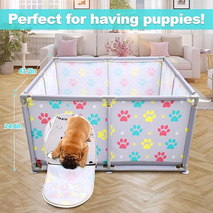- 24.8'' Extra Tall Box Set for Puppies and Kittens: our dog whelping pen measures about 48 inches in diameter, and 24.8 inches in height, foldable and portable, easy to clean, your newborn babies will have plenty of room to grow and play; the four side walls of the whelping box for dogs is made of visible and breathable mesh fabric. Whether sitting or lying, pets can see from multiple sides inside the fence.