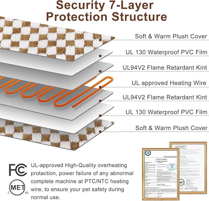 - 7 layer Protective Structure: The PVC envelope with waterproof and flame-retardant function. With UL-certified heating wire protect pets from burns. Built-in intelligent temperature sensor with high temperature protection for preventing overheating to protect pet's safety. Don’t let your pets lay on the pet heating pad directly without a plush cover.