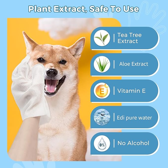 - 【Glove Shaped Dog Bath Wipes】Our dog wipes are made of extra thick,durable non-woven fabric. The glove-shaped wipes are designed to be more convenient to use. They are double-sided and impermeable to prevent stains from staining your hands. What's more, they're gentler on your pet's sensitive areas, making your pet feel comfortable and relaxed.
