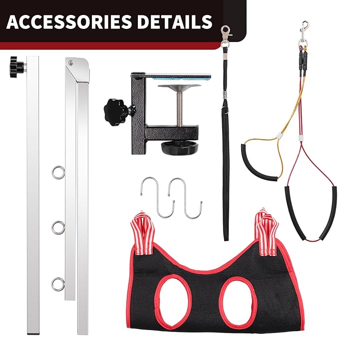 - The set includes three essential accessories: a pet grooming hammock for small dogs, no sit haunch holders made of durable steel wire, and a nylon loop noose for quick and easy handling. Each accessory is designed to enhance the grooming process, making it safe and comfortable for your pet.