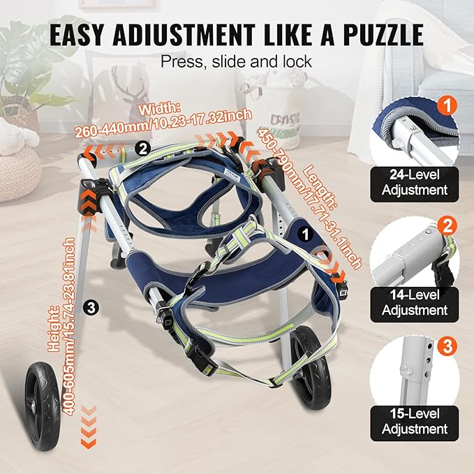 - Comfortable Drive: Pets are one of our family members, and when their hind legs are disabled, please don't give up. A wheelchair may give them a second chance. With 8 inch EVA wheels and secure straps, the dog wheelchair for back legs provides a smooth and quiet ride for pets, ensuring stability and silence on any surface.