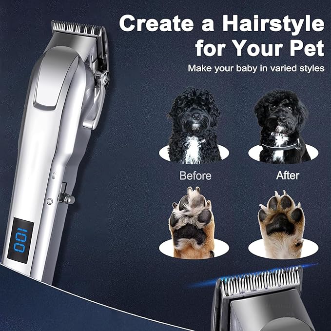 Cordless Dog Clippers for Grooming Professional for Thick Hair Coats, Low Noise Shaver Grooming Kit with LED Display, Razors Dog Hair Shears Ceramic Blade, Pet Hair Trimmer for Dogs Cats