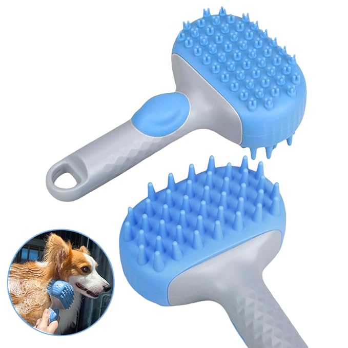 QMEAKMONY Dog Bath Brush Shampoo Brush Scrubber for Bath with Soap Dispenser Soft Bristles Deep Cleaning Ergonomic Handle for Grooming Shedding and Long Short Haired Dogs (Blue Blue)