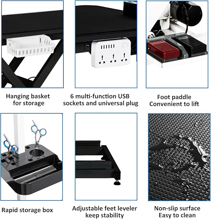 - Relaxing Grooming Session: Adjustable base and arms, and the wide range of accessories will ensure relaxing grooming sessions for both pets and groomers. Storage box to keep beauty tools at hand; AC outlet and USB port add-on for easy access to grooming equipment; Use with grooming noose, adjustable arms, and restraint ring to keep pets in position for prolonged grooming with injury prevention
