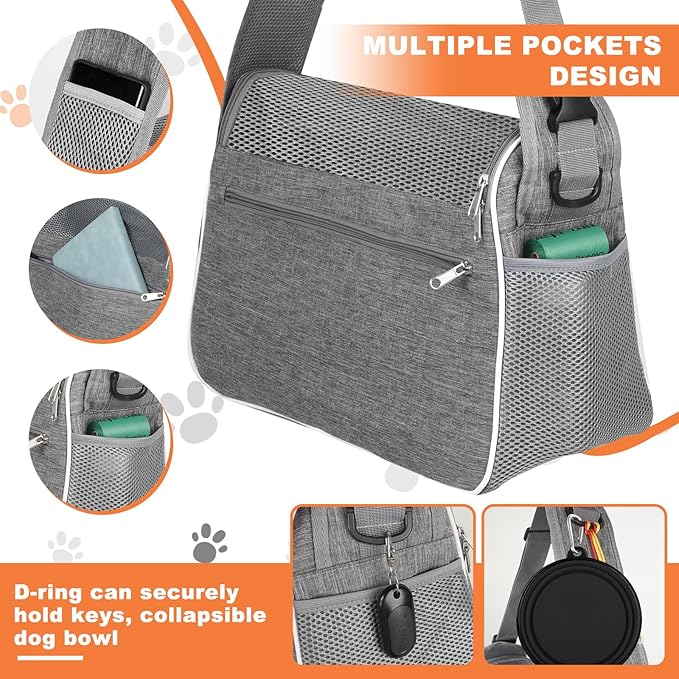 - Multiple Pockets Design: The dog sling carrier features a spacious zippered pocket on the back, a small zippered pocket and a D-ring on the side, and a mesh pocket on the shoulder strap for easy access to essentials like your phone, purse, dog leash, collapsible dog bowl and poop bags