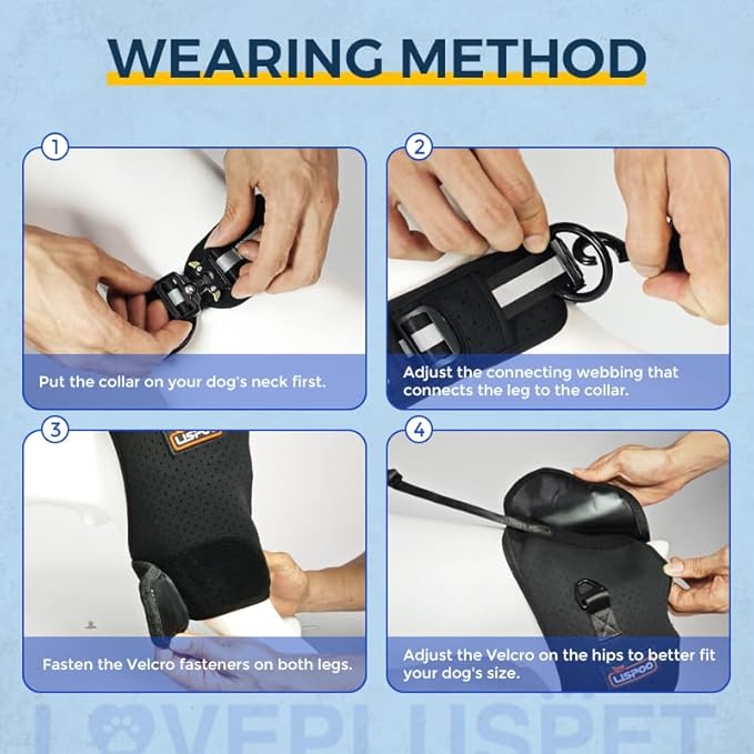 - EASY TO PUT ON AND CLEAN : Dog hip dysplasia brace can be easily put on the dog according to the steps of putting on the brace. Hip brace for dogs is portable and can be taken out and about with your dog outdoors to help your dog have a healthy and happy life. Dog hip brace's fabric is easy to be wiped with a clean cloth or hand wash, very easy to clean and is ideal for taking out and about outdoors.