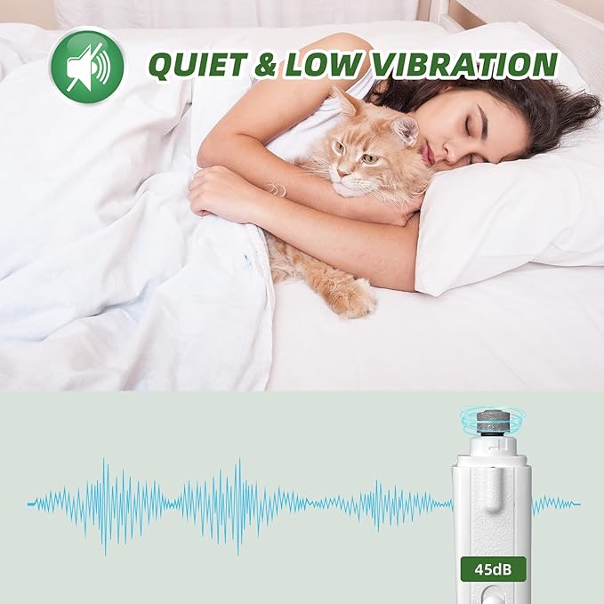 - Quiet Electric Dog Nail Files:The pet nail grinder features a diamond drum bit and a powerful motor that provides effective and easy grinding for your pets,The pet nail grinder runs quietly and lower than 45dB,would not make your pets nervous,There are 3 ports of the grind bit to match the small,medium,or large pets, choose the appropriate port according to your pet's size.