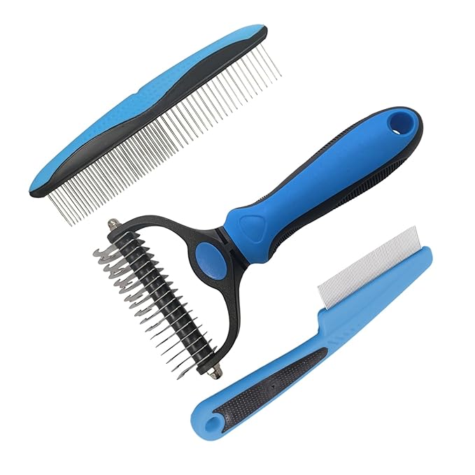Pet Grooming Kit - Deshedding Brush with Metal Comb and Flea Comb for Detangling and Removing Matted Fur, Fleas on Cats and Dogs