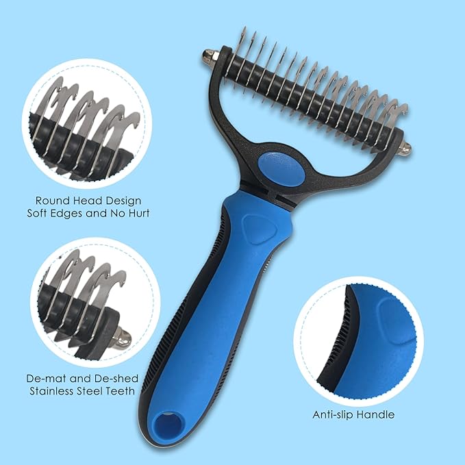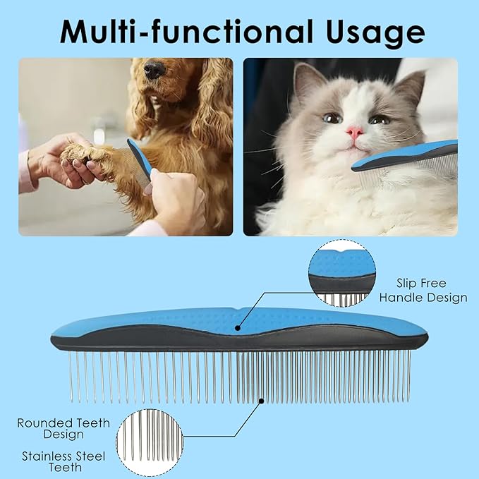 - 【Sturdy and Comfortable Design】: Premium Stainless steel metal teeth and compact design make our product sturdy and durable. High-quality & lightweight TPR handle make your grooming effortlessly. High-quality undercoat rake for dogs double coat, metal comb for dogs, dematting comb for cats, dog comb for matted hair.