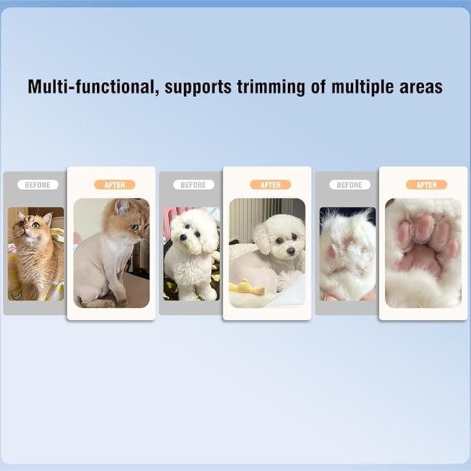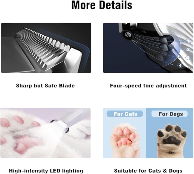 - 2, The Paw Trimmers for Small Areas: Suitable for cats and dogs. The sharp, small blades easily handle furs around paws, ears, eyes, and private areas, making grooming quick and safe. The high-brightness LED light illuminates small areas, allowing you to clean excess fur in deep crevices, keeping your pet clean and hygienic.