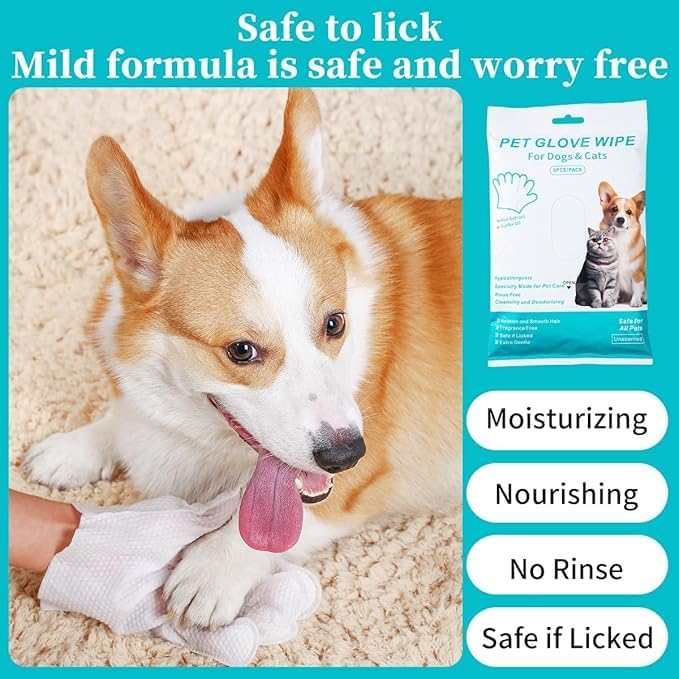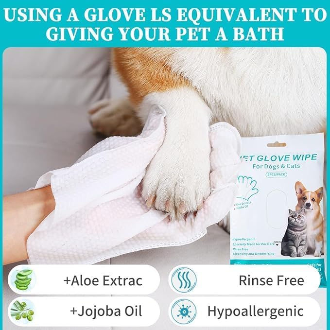 Pet Glove Wipes for Dogs & Cats, Pack of 6, Aloe Extract, Jojoba Oil, Rinse Free, Cleansing and Deodorizing