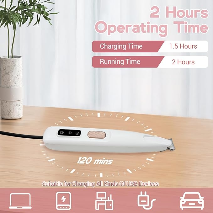 - Portable Charging: Our rechargeable electric dog trimmer with light for pet hair trimming can be charged with a USB device at home, making it portable. It can also be used while charging.