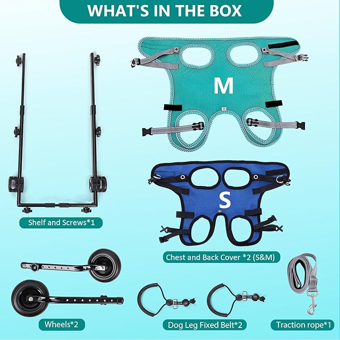 - 【Heart-warming design】 - Pets will be troubled by inconvenient movement in life.Long-term inability to exercise will affect of the pet and reduce his confidence. Our dog wheelchair is designed for pets with impaired hind legs but nice front legs, helping them regain the joy of walking, running, and playing.
