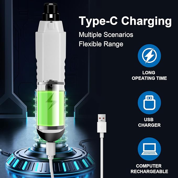 - USB Rechargeable & Long Lasting Operation - The cordless dog nail grinder recharge by USB with indicator light, make it more convenient. 3 hours charging time with up to 8 hours using time, the new stable charging system greatly improves nail files’s lifetime, Pet dog nail clipper is perfect for pet grooming store or home using, horses grooming supplies