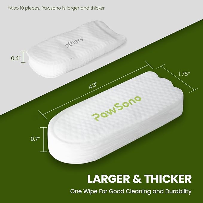 - 【Extra Larger & Thicker】PawSono cat ear wipes custom-sized for the US market. Our pet ear wipes new size eliminates the need to worry about fingers being big to wear them, and eliminates the concern about dog ear wipes finger slipping off.
