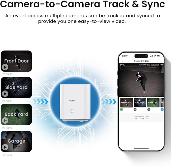 - Cam-to-Cam Smart Tracking & All-at-Once Monitoring: View real-time footage from all your cameras simultaneously on your phone—effortlessly monitor your entire property at a glance. Advanced Cam-to-Cam tracking syncs intruder movements across cameras, reconstructing their full path from entry to exit in one seamless, time-aligned playback—no need to switch feeds, no details missed.