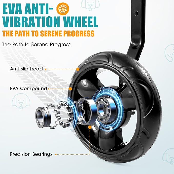 • Faster Recovery: This Dog Wheelchair for Back Legs's lightweight construction, at just 1.1LB, aids in accelerating your dog's return to athletic form without adding undue strain. The durable EVA silent wheels ensure a smooth, quiet ride, helping your dog adjust to the wheelchair with ease