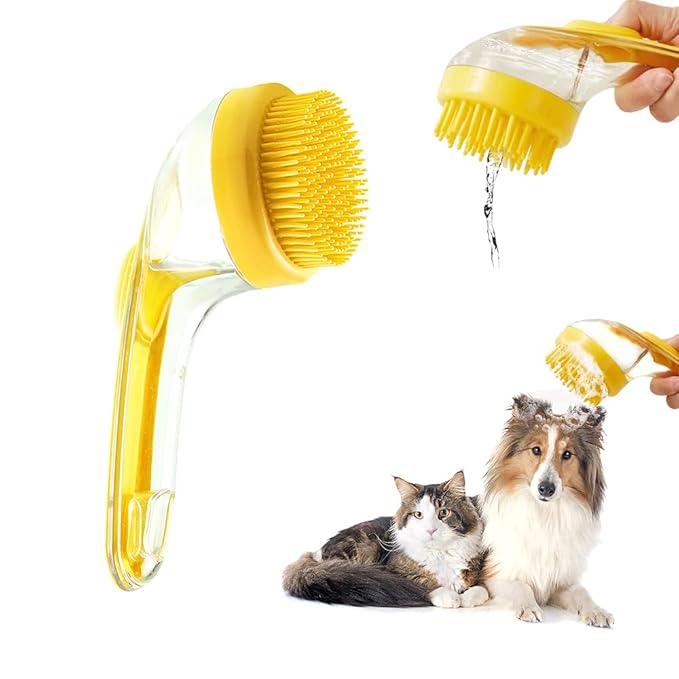 - 【Ergonomic Pet bath brush】Shampoo dispensing design, ergonomic handle,Pour in pet shampoo and water and shake well,High quality lightweight TPR handles make grooming your pet effortless, Can effectively remove pet hair, Let your pet enjoy bath time