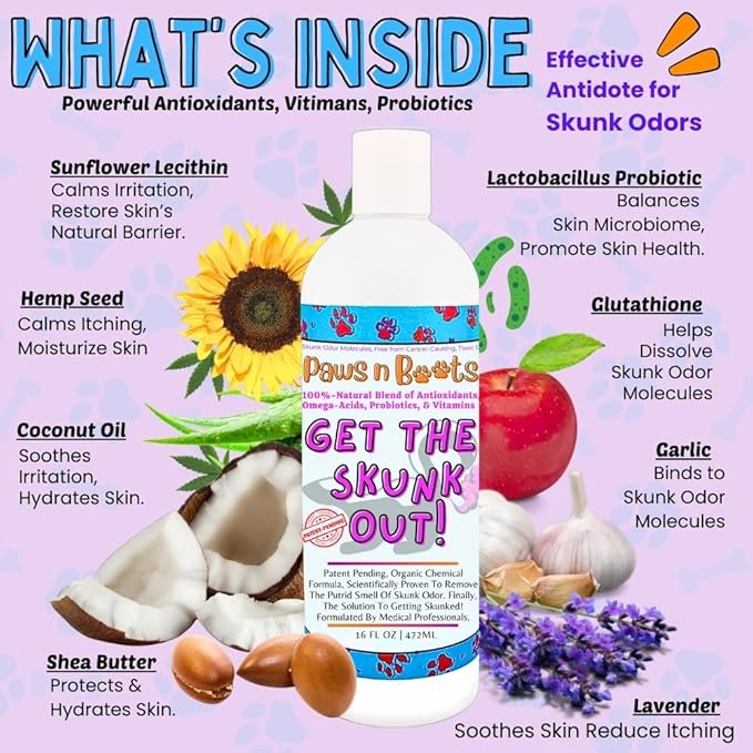 - THE ONLY ORGANIC SOLUTION TO GETTING SKUNKED: Unlike Other Skunk Odor Removal Shampoos That Contain Neurotoxic, Genotoxic, And Cytotoxic Ingredients Harmful to Dogs and Cats, As Well As Carcinogenic Chemicals or Poisons, We Prioritize Your Pet's Safety. Our Formula Features Wholesome Ingredients Sourced Directly from Mother Earth.