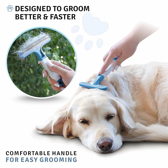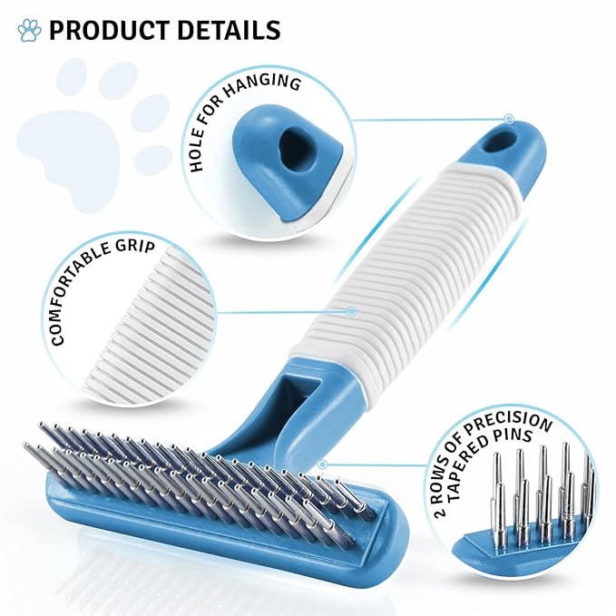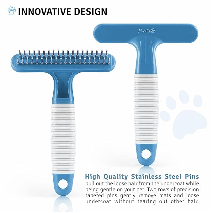 POODLIE Poodle Pet Dog Grooming Rake | Dematting Tool with Stainless Steel Shedding Comb for Pets | 2 Rows of Pins Gently Remove Loose or Tangled Hair from Undercoat (Blue)
