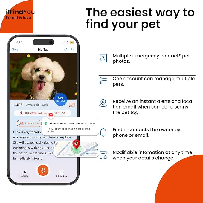 - Integrated Personalized Dog ID Tags: ilFindYou smart QR code dog tags personalized for pets contain modifiable pet online profile, emergency Info, multiple pet photos, when finders scan the QR code you will receive a real-time alert via email or phone call, It is not a GPS tracker