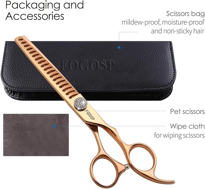 - [Professional Quality]FOGOSP dog scissors for grooming is made of high quality Japanese 440C stainless steel and is very sharp and smooth that using these grooming shears are like cutting butter with hot knife. Trimming thick coat dogs is easy and effortless.