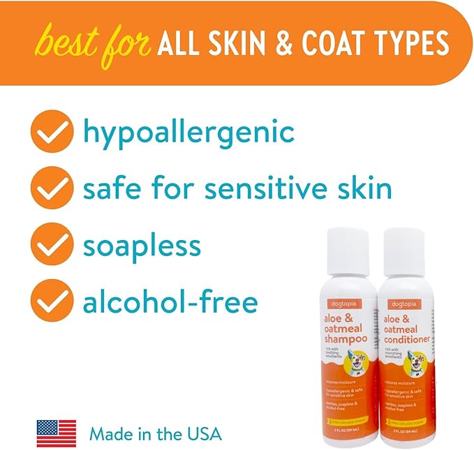 - Aloe & Oatmeal Formula – Shampoo and conditioner gently cleanse and moisturize for a soft, healthy coat.