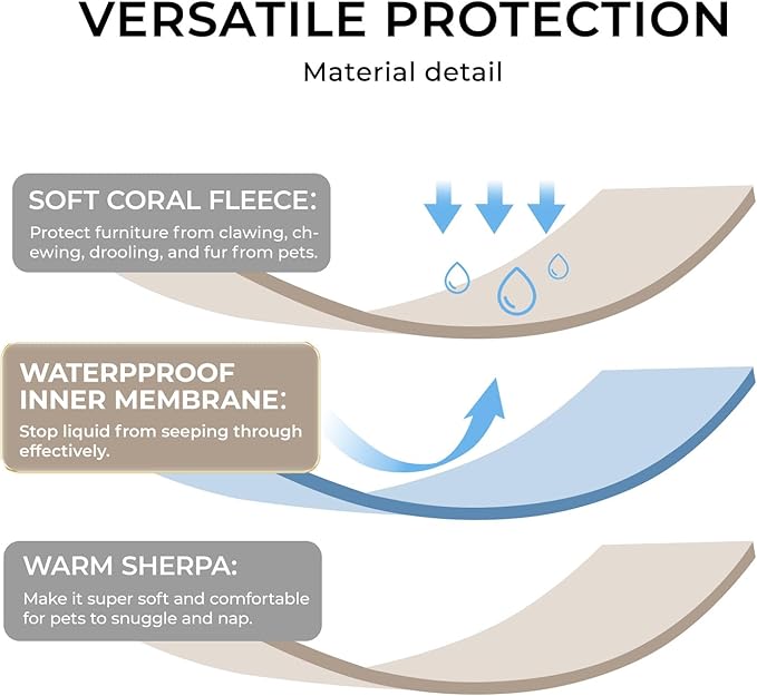- TRIPLE LAYERS DESIGN - Soft thick fleece on one side and plush sherpa backing on the other to keep your pets comfy, warm and dry. Internal waterproof lining provides defense and stops liquids from seeping through. NOTE: The surface of the fiber itself is not waterproof!