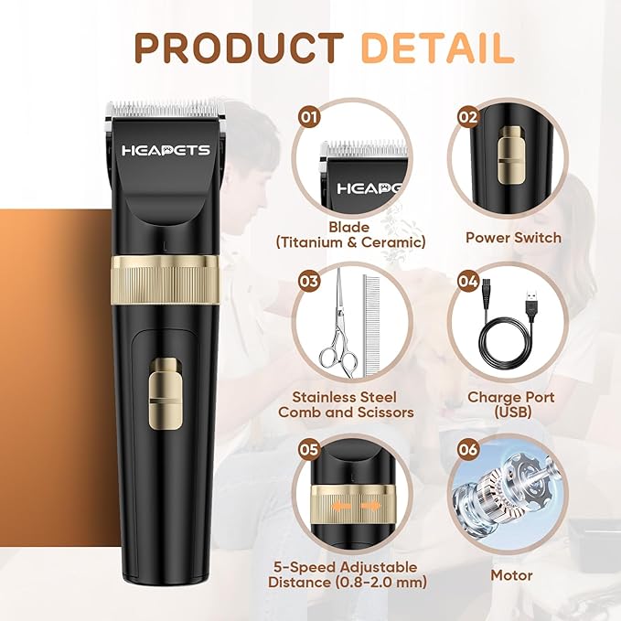 - Blades are sharp and safe: HEAPETS dog grooming clippers equipped with high-quality ceramic blades, sharp and durable, it can quickly trim even thick hair, no stuck hair no hurt skin, giving your pet a good haircut experience.