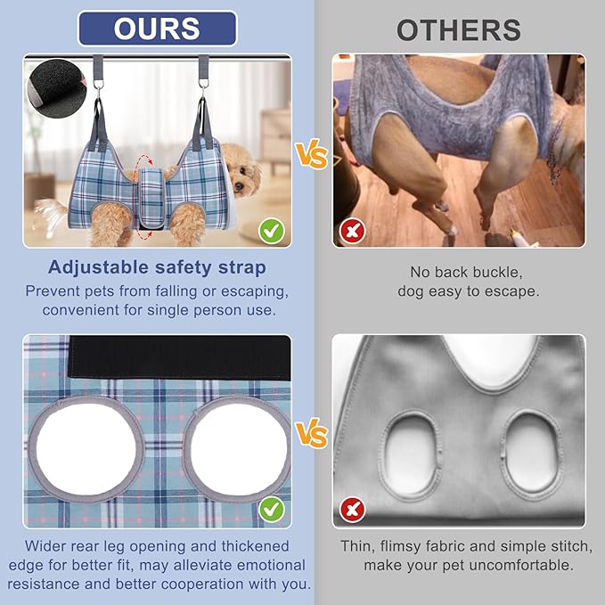 - Comfortable and Safe Hanging Dog Harness for Nail Trimming- 3D air mesh with thickened edges makes this pet grooming sling increase breathability and sturdiness. In addition, dog/cat restraint grooming bag has an Upgraded wider under body support & larger frontal chest/neck space, plus more spacious hind leg openings to keep back legs from pinching. Our Heavy-duty carabiners with better weight bearing, and are more durable secure than other S-hooks