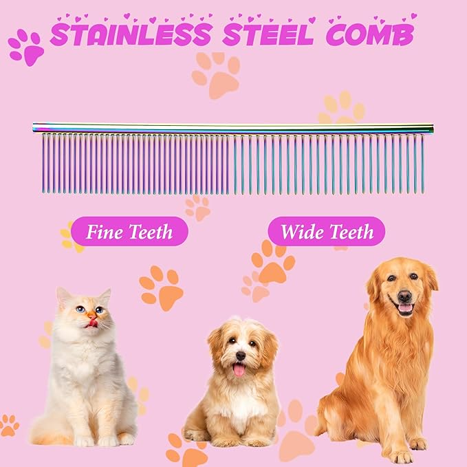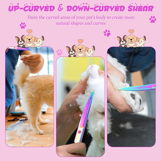 - 1. The Ultimate 8-Piece Pet Grooming Scissors Set: This set includes a 7.72-inch Straight Scissor, 7.74-inch Up-curved Scissor, 7.68-inch Down-curved Scissor, 7.48-inch Thinning Scissor, Cleaning Cloth, Leather Bag, Comb, and Screw Tension Adjuster. It's perfect for personal use and pet stores, making it an essential grooming kit for pets.