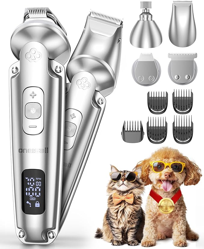 oneisall Dog Clippers and Paw Trimmer with Low Noise, 4 - in - 1 Cordless Dog Grooming Kit with 3 - Level Speed Clippers (7000 RPM) for Grooming Thick Hair, Waterproof Shaver for Dogs and Cats