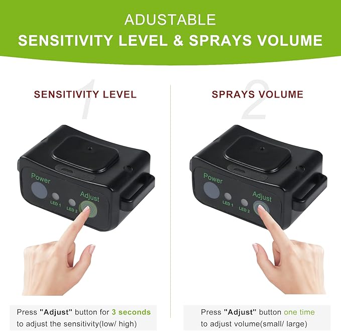 - 【2 Level Sensitivity & 2 Level Spray Volume】 The citronella dog bark collar comes with two adjustable sensitivity levels (high & low) and spray volume(small & large). You can adjust the sensitivity of the anti bark collar to match your dog's barking and the environment, choose the appropriate sprays volume for your dog accordance with the size of your pet.