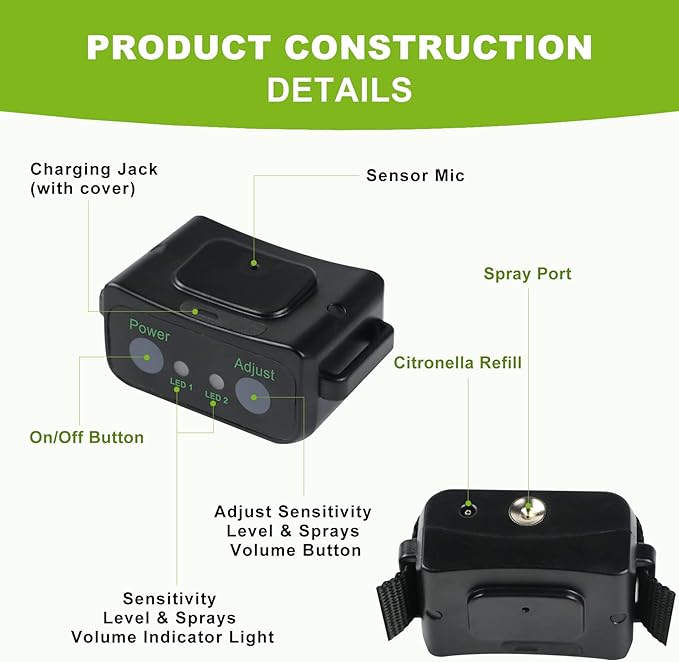 - 【Package Includes】 1 x citronella bark collar, 1 x citronella spray refill, 1 x adjustable nylon collar strap, 1x USB charging cable, 1 x product manual. Please reach out to us via Amazon Message Center should you ever run into any issues with it at all, our friendly team is happy to help.