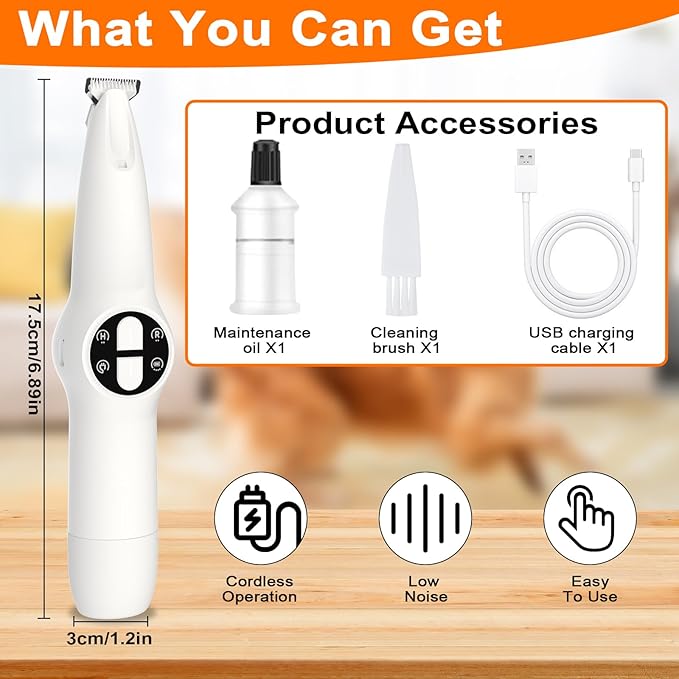 - 【What You Can Get】 Electric dog trimmer for paws*1, Charging cord*1, Cleaning brush*1, Lubricating oil*1, User manual*1. Our dog grooming kit also come with oil to keep the pet paw trimmer greased to prevent snags. 24-hour online service, contact us at any time if you have any questions.
