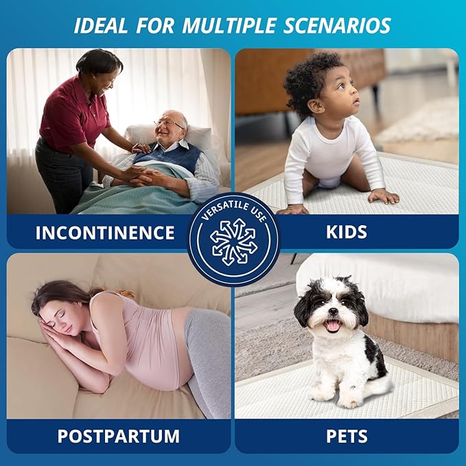 - VERSATILE USE: WhyWorry bed pads are versatile and suitable for multiple scenarios of use. They can be used to protect beds, furniture, hospital bed sheets, and all other surfaces for individuals experiencing incontinence. Additionally, they are ideal for women during menstrual periods and pregnancy, as well as used as baby changing mats and pet training pads.