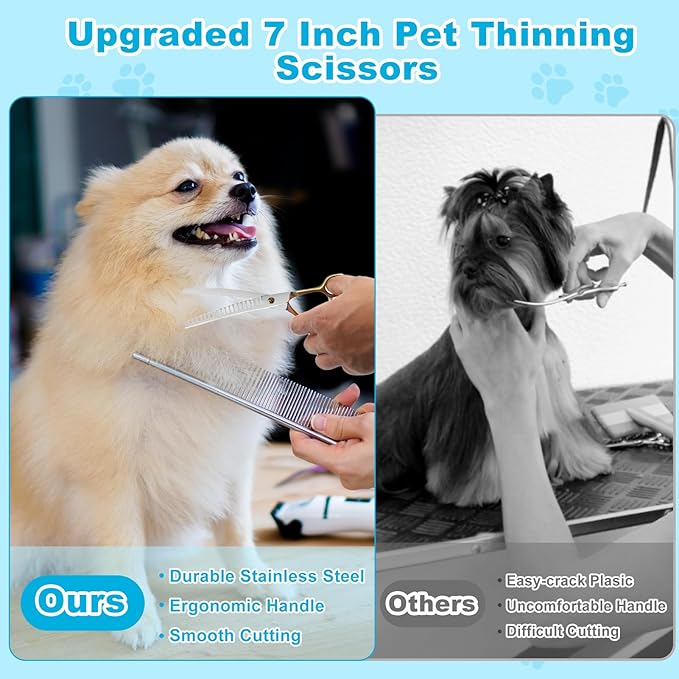 - Stainless Steel:Crafted from high-quality stainless steel, these 7-inch pet thinning scissors are built for long-lasting performance. for regular grooming sessions, ensuring durability and sharpness with every use.