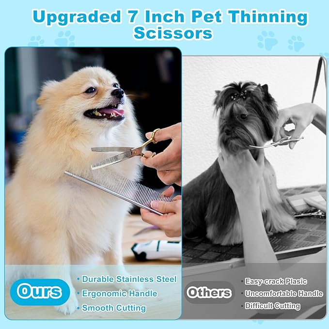 - Stainless Steel:Crafted from high-quality stainless steel, these 7-inch pet thinning scissors are built for long-lasting performance. for regular grooming sessions, ensuring durability and sharpness with every use.