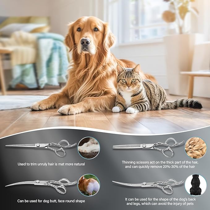 - 【Dog grooming scissors set applicable scene】Set is composed of different curved grooming scissors for dogs,suitable for various animals such as dogs,cats,rabbits,etc.