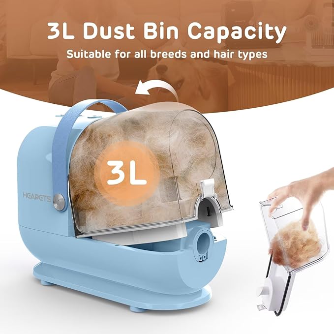 - Upgraded 3L Max Dust Bin Capacity: dog hair grooming vacuum is equipped with a 3L dust cup. The 70% larger capacity lets you clean the dust cup less often while trimming for greater efficiency. Empty the dust cup without hand touch. Simple operation makes every trimming more enjoyable.