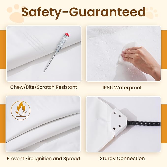 - 【Durable and Safe Design】Crafted with IP68 waterproof material and a chew-proof cable, our pet heating pad is built to last. It ensures durability and persistence while keeping your beloved pet safe. No more worrying about accidental spills or curious chews ruining your heating pad.
