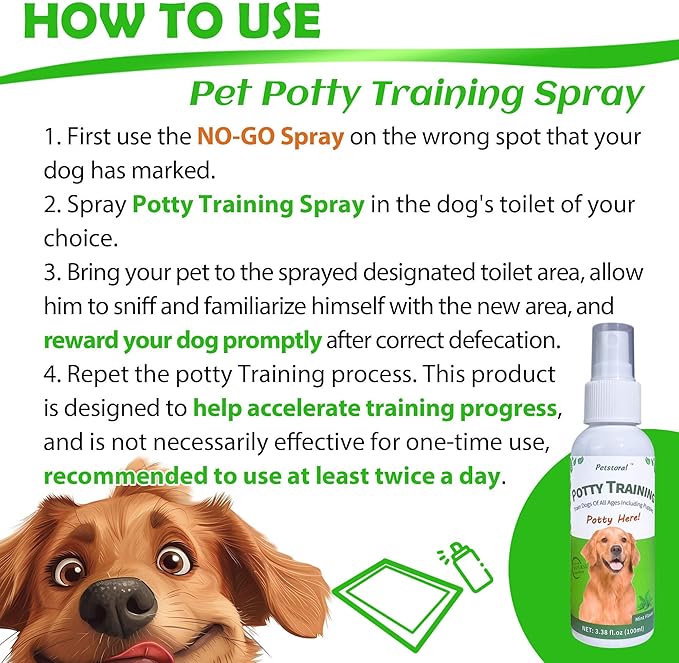 - 【Training Everywhere, Easy to Use】Whether you use it indoors, outdoors, on a puppy training mat, artificial grass or dog pee post, simply use the No-Go Training Spray where you don't want your pet to go, and Potty where you want your pet to defecate! Training Spray, combined with hand signals and rewards, can quickly train your pet.