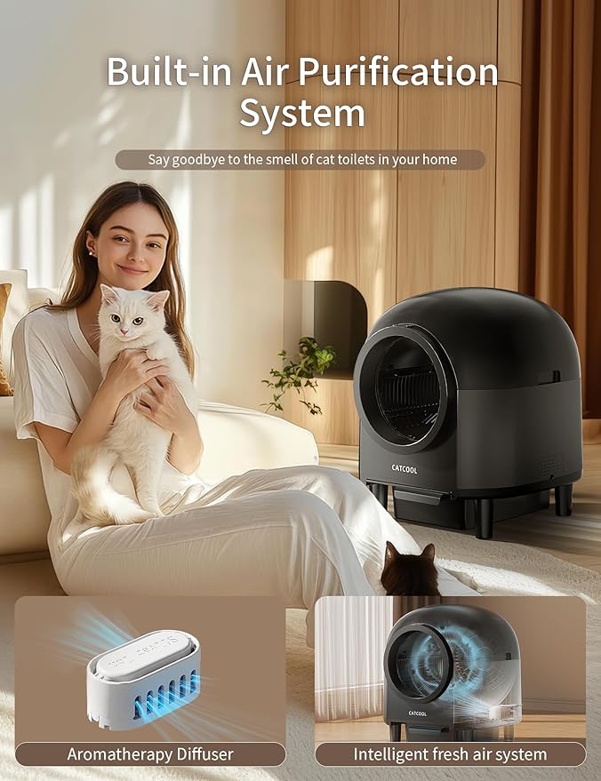 - 【True odor control】CATCOOL electric litter box features a semi-enclosed design that offers odor control 5 times better than traditional litter boxes. This design effectively isolates the litter to reduce odor spread while maintaining an open feel. The electric cat litter box self cleaning drum interior is equipped with an advanced odor elimination and fragrance system that breaks down odor molecules inside the electric cat litter box, keeping the air fresh. Additionally, our ventilation system actively expels odor molecules with a built-in fan.This innovative design not only enhances odor control but also provides a more comfortable and fresh environment for your home.