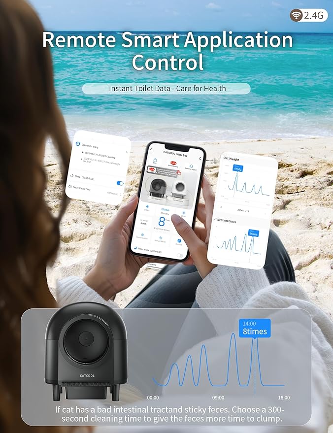 - 【App tracks cat's health】CATCOOL auto litter box self cleaning can be easily connected to the dedicated APP for remote control and monitoring (please refer to our connection diagram steps). The self cleaning cat box APP can track the frequency and duration of cat use and provide detailed data reports to help you evaluate your cat's health. In addition, you can immediately control the auto cleaning litter box cleaning and deodorization through the APP.