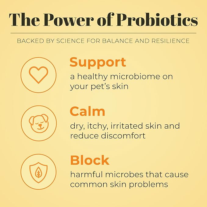 - Probiotic Formula- Each bottle contains topical probiotics that help support a healthy microbiome to defend against common skin problems such as itching, odor, dryness, dandruff, hot spots, and excessive shedding.