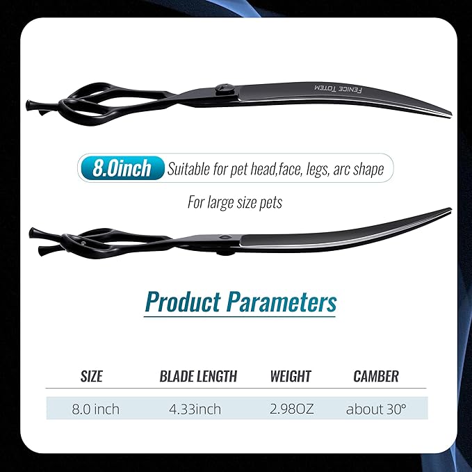 - Features: This pet curved scissors are available in 8.0 inches with ergonomic handles, suitable for most people. Finely polished, frosted surface, fine metal texture. precise adjustable screws effectively prevents screws from loosening due to prolonged use