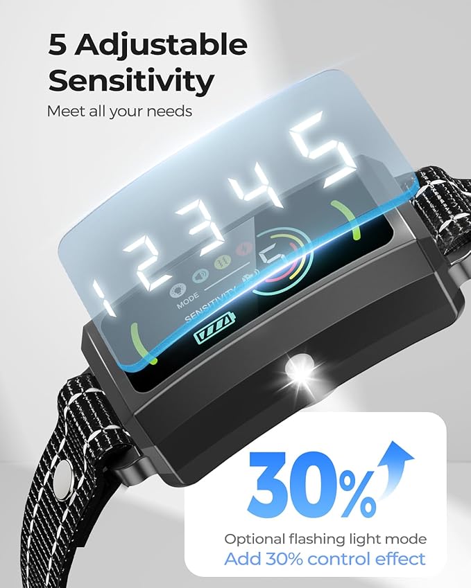 - 5 Humanized Modes: The GAJUX dog bark collar offers 5 training modes: beep, vibration, beep + vibration, safe shock, and a flashing light feature for an additional 30% control effect. With adjustable sensitivity levels ranging from 0 to 5, you can easily customize the level of stimulation that works best for your furry friend, which is helpful in deterring dogs from undesirable habits