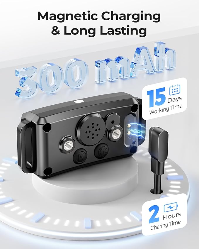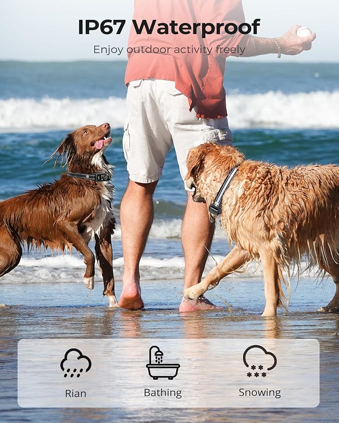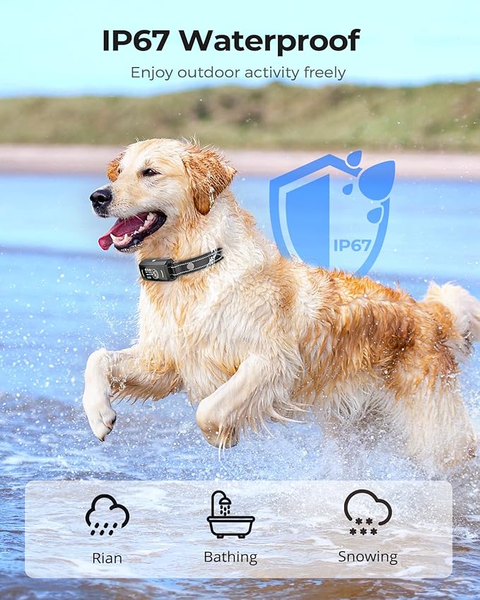 - Long Battery Life & IP67 Waterproof Design: The bark collar for large dogs fully charges in just 2 hours and lasts up to 15 days on a single charge. With an IP67 waterproof rating, it's perfect for training sessions by the pool, at the park, on the beach, or in your backyard, no matter the weather