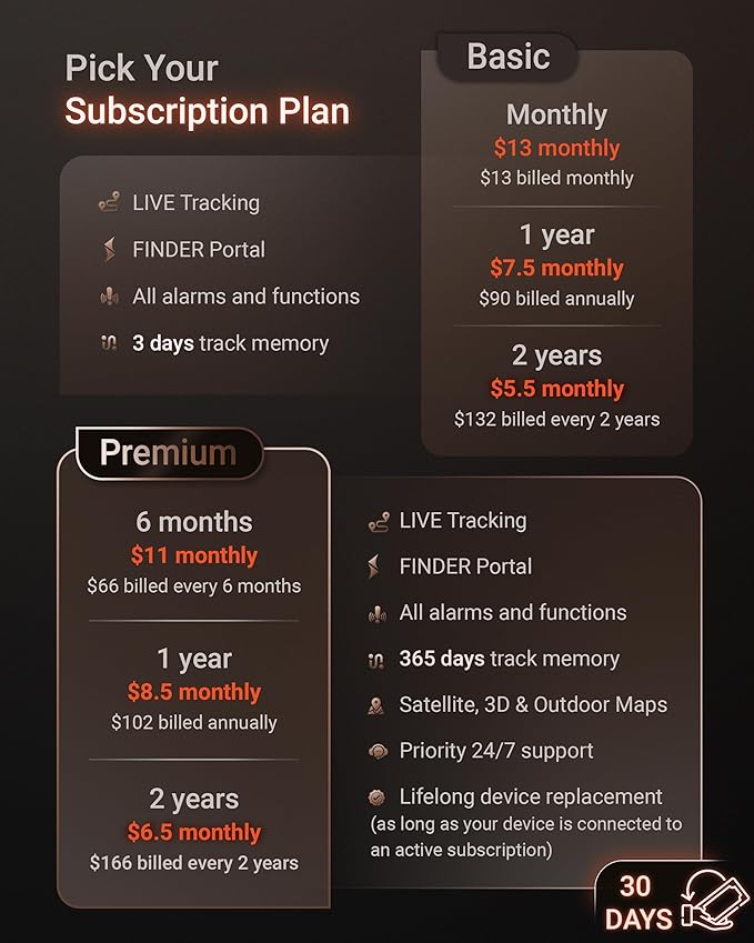 - CONVENIENT SUBSCRIPTION OPTIONS: With a built-in SIM card and 24/7 multilingual support, you can easily track your dog via the PAJ app. Choose between Premium or Basic subscription plans starting at just 5.5 USD per month, offering flexible options to suit your needs.
