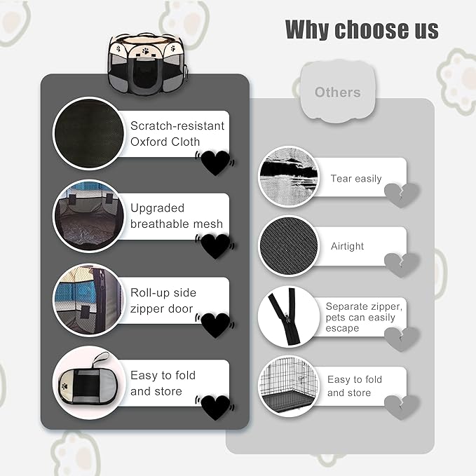 Portable Dog Playpen, Pet Play Pen for Indoor Outdoor Cat, Adult Kitten/Puppy Exercise Playpen Tent Birthing Box, Waterproof Travel Dog Camping Cage for Medium Large Dog Animal House (Grey)